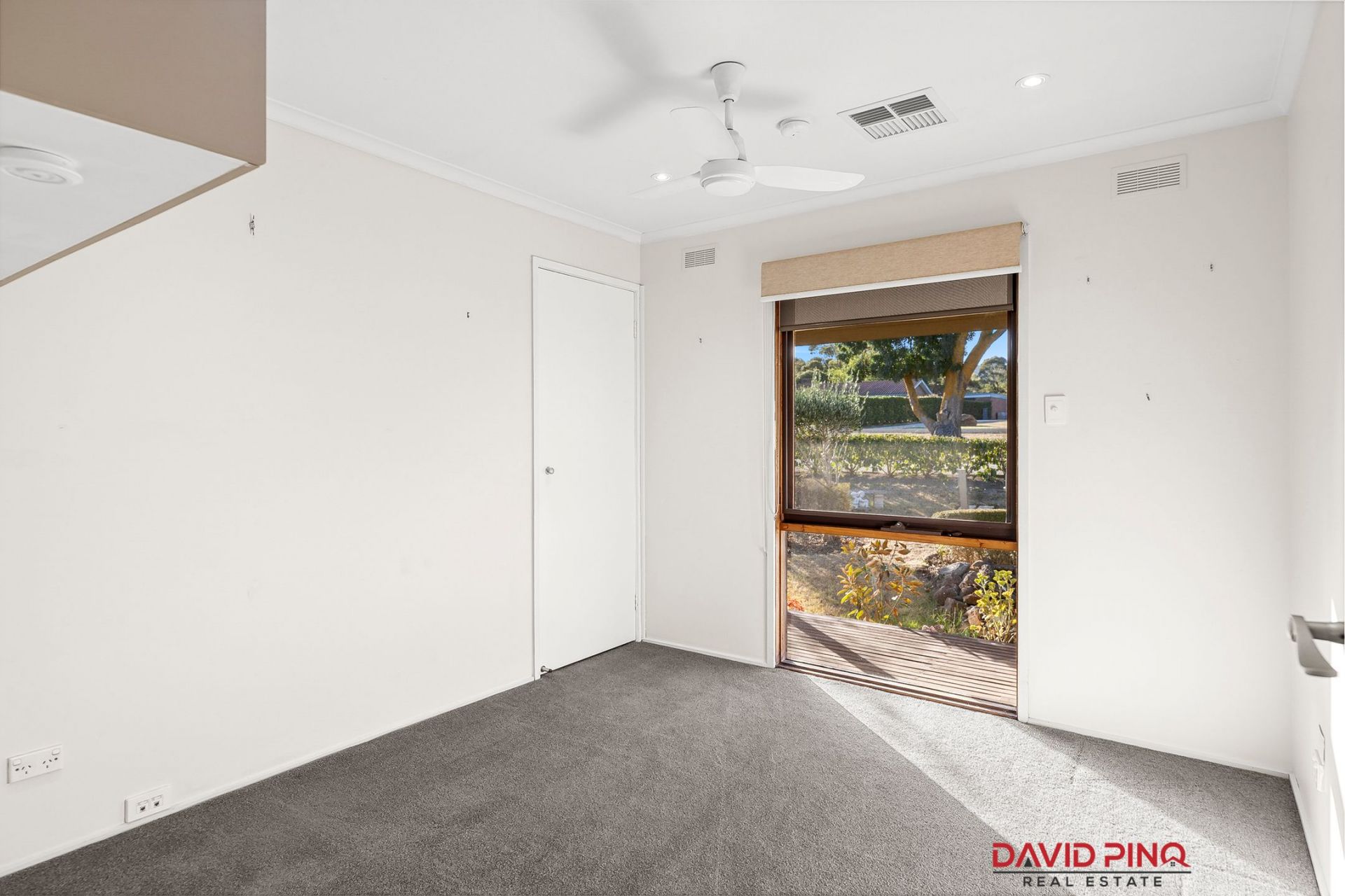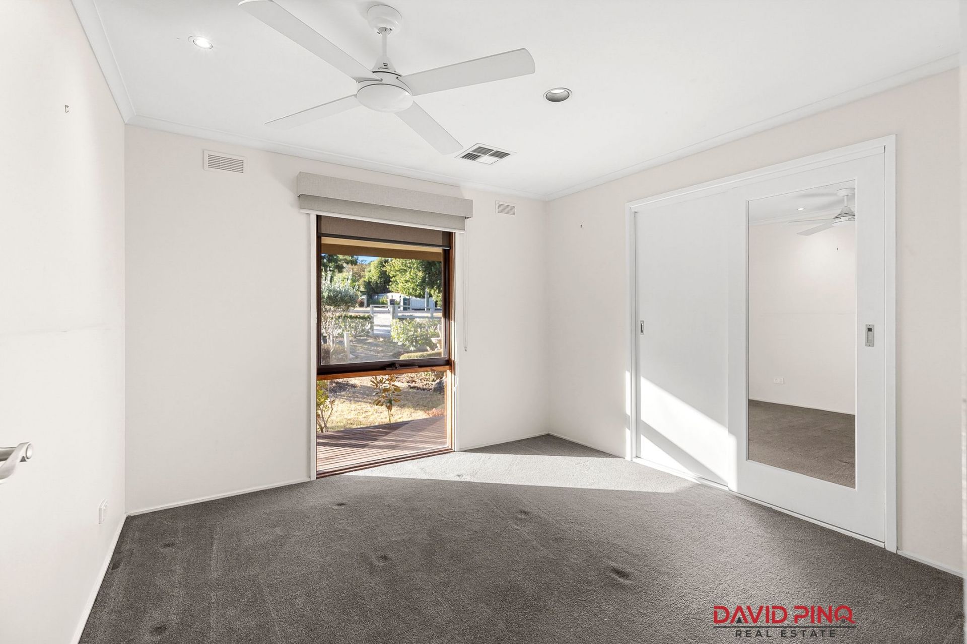 The master bedroom is equipped with a ceiling fan and double built-in robes, providing ample storage. The second bedroom features a ceiling fan, a single BIR, and an overhead cupboard, while the third bedroom offers a ceiling fan, carpeted flooring, and double BIR.