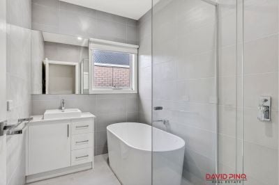 A luxurious main bathroom with a freestanding bath and full-height tiles, along with a separate toilet and a well-appointed laundry with stone benchtops and cabinetry, add to the home's modern appeal.