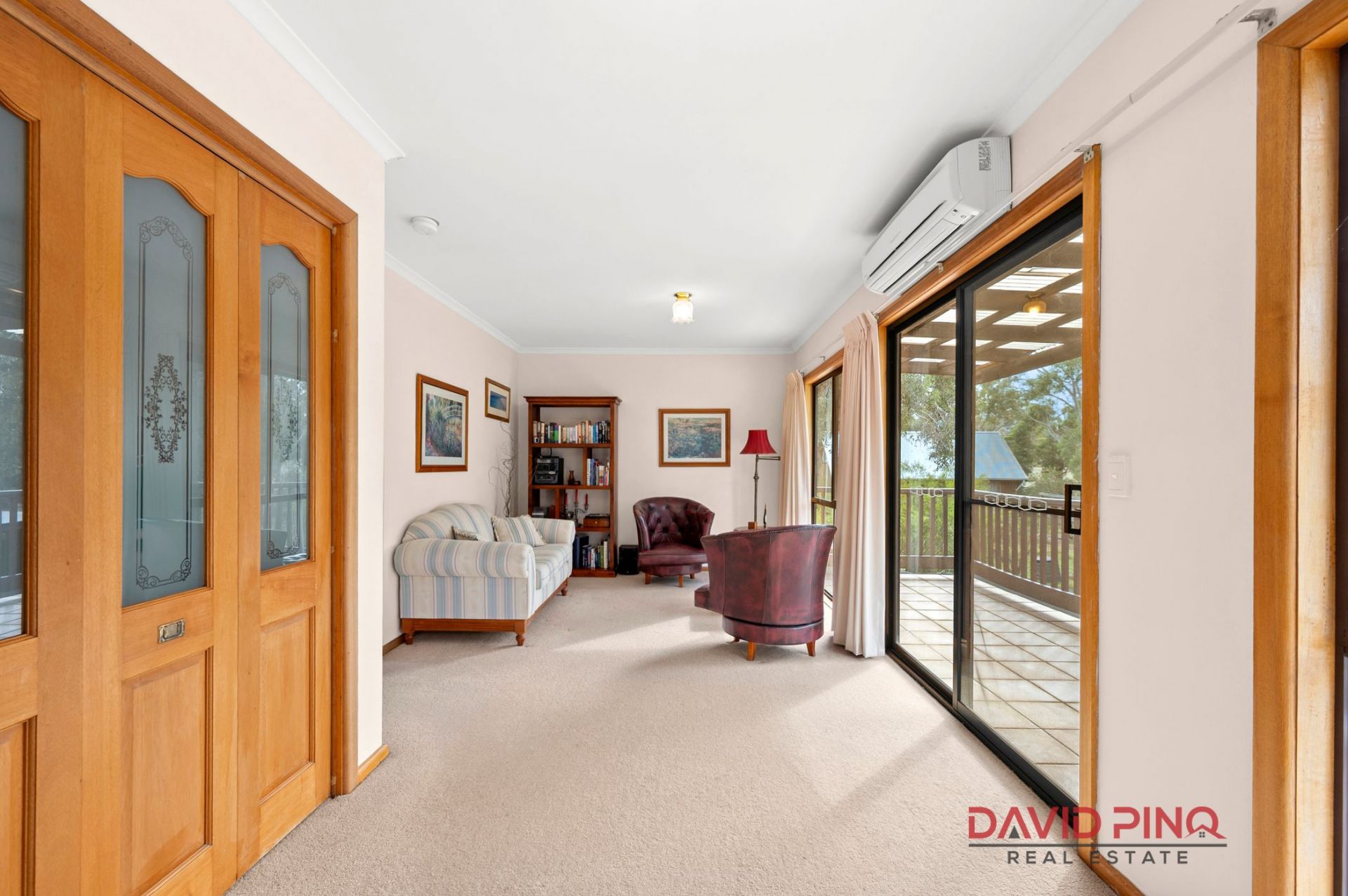The heart of the home is the open-plan kitchen, dining, and living zone, complete with solid timber flooring, a modern kitchen with island bench, and outdoor access to a covered alfresco – perfect for entertaining year-round. A second carpeted lounge with a feature brick wall and wood heater provides a cosy, relaxed space to unwind.