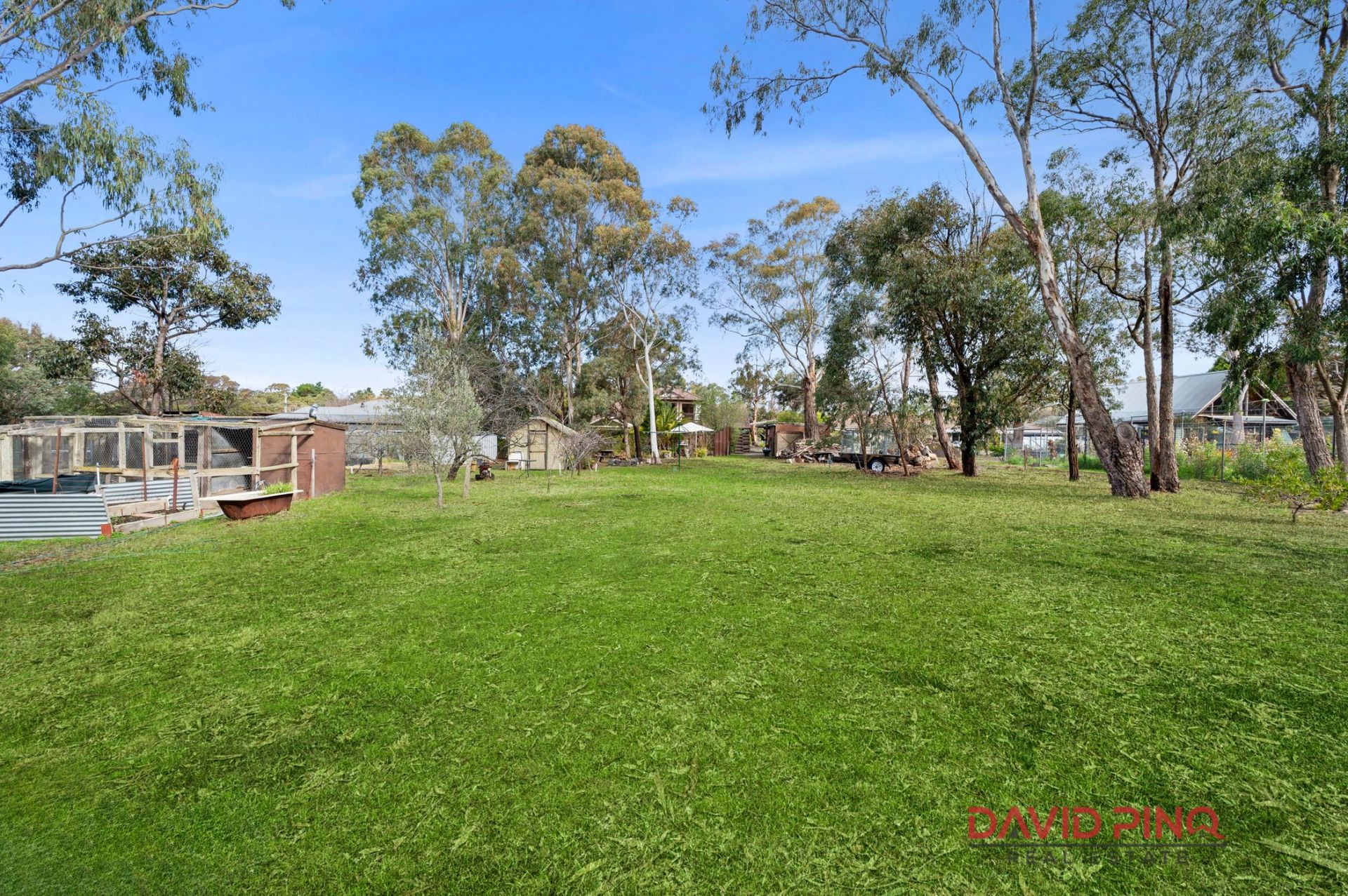 Fully fenced front yard, raised garden beds, fruit trees, chicken coop, and garden sheds