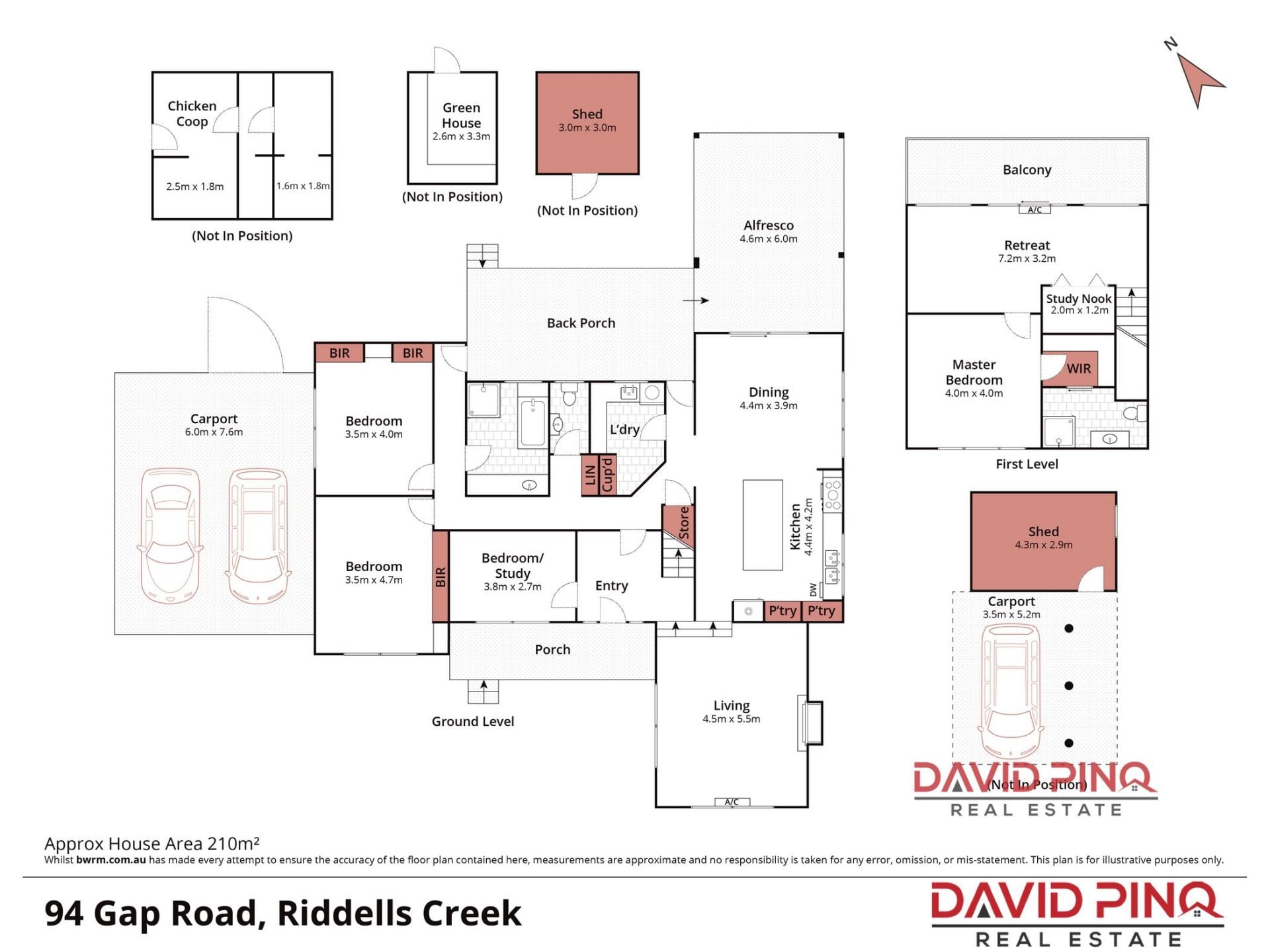 High clearance double carport at front, single rear carport with attached shed